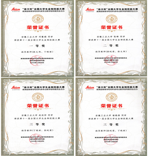 学子分获一二三等奖,其中邓慧娟同学荣获全国金相大赛一等奖,张峰同学荣获全国金相大赛二等奖,赵欣彤和谢晓倩同学荣获金相大赛三等奖。