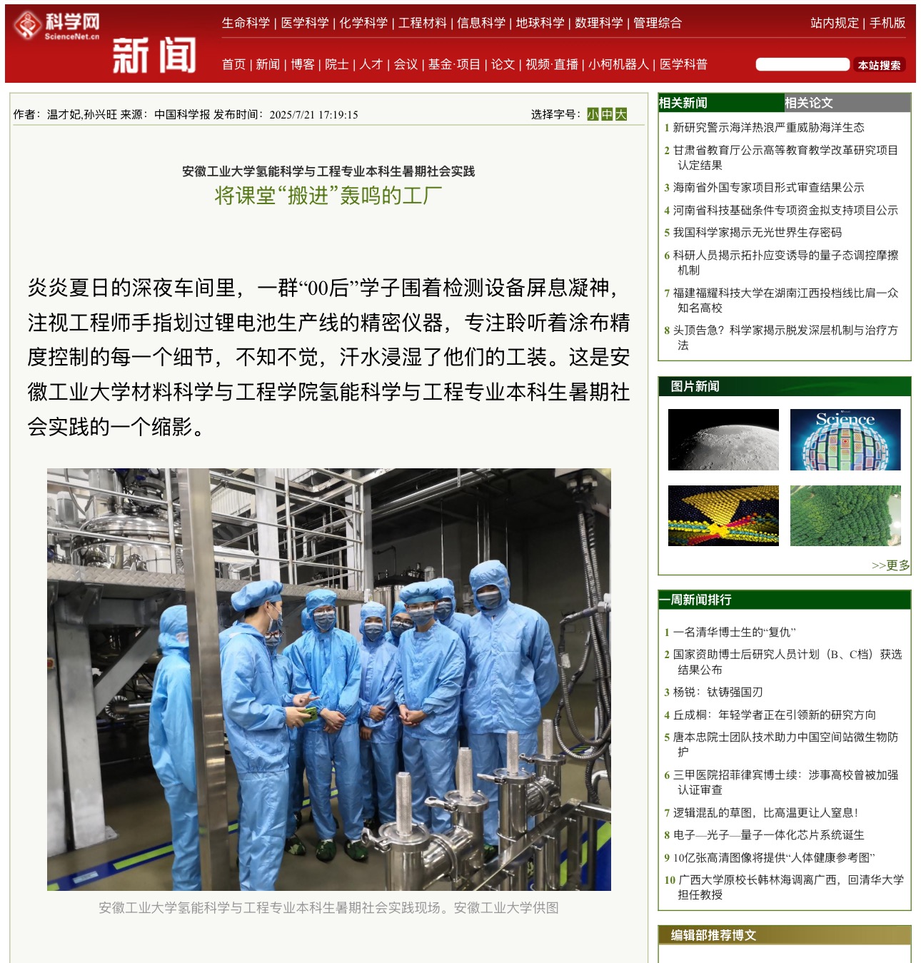 这个七月,安徽工业大学氢能科学与工程专业学子的身影穿梭于长三角的车间与实验室,以青春的热情和扎实的专业知识服务于产业需求,他们承载着科技创新驱动高质量发展的时代使命,为长三角氢能产业注入蓬勃的青年力量。