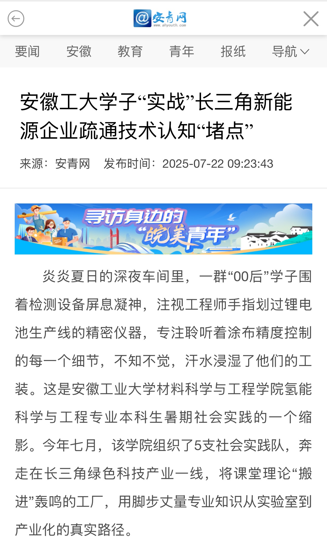 这个七月,安徽工业大学氢能科学与工程专业学子的身影穿梭于长三角的车间与实验室,以青春的热情和扎实的专业知识服务于产业需求,他们承载着科技创新驱动高质量发展的时代使命,为长三角氢能产业注入蓬勃的青年力量。