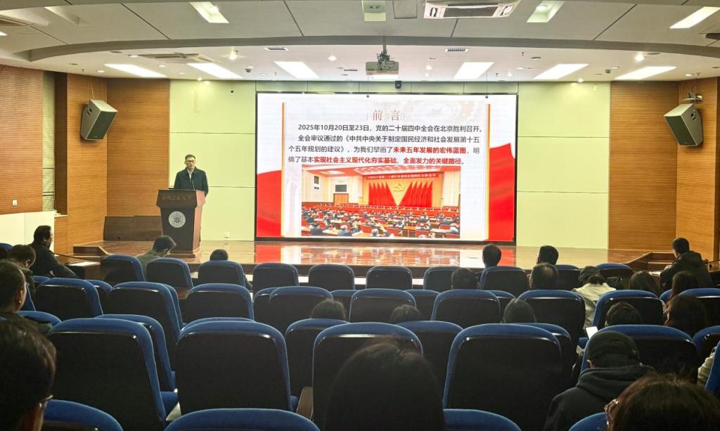 11月10日下午,学院在秀山校区振华图书馆学术报告厅召开全院教师大会,传达学习党的二十届四中全会精神。学院全体领导班子成员及全院教师参加了会议。会议由学院党委书记杨建主持。