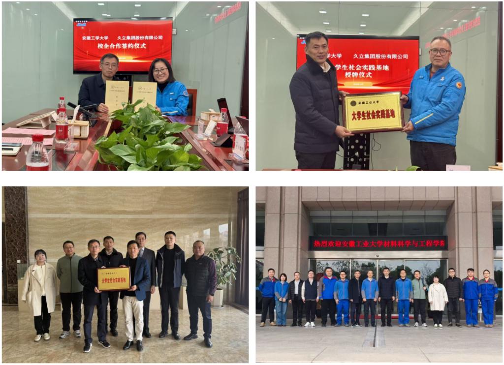 经过充分磋商,杨建代表学校向企业授予“安徽工业大学大学生社会实践基地”牌匾;柳东明代表学校分别与企业签订《人才培养与就业基地合作协议书》,并合影留念。