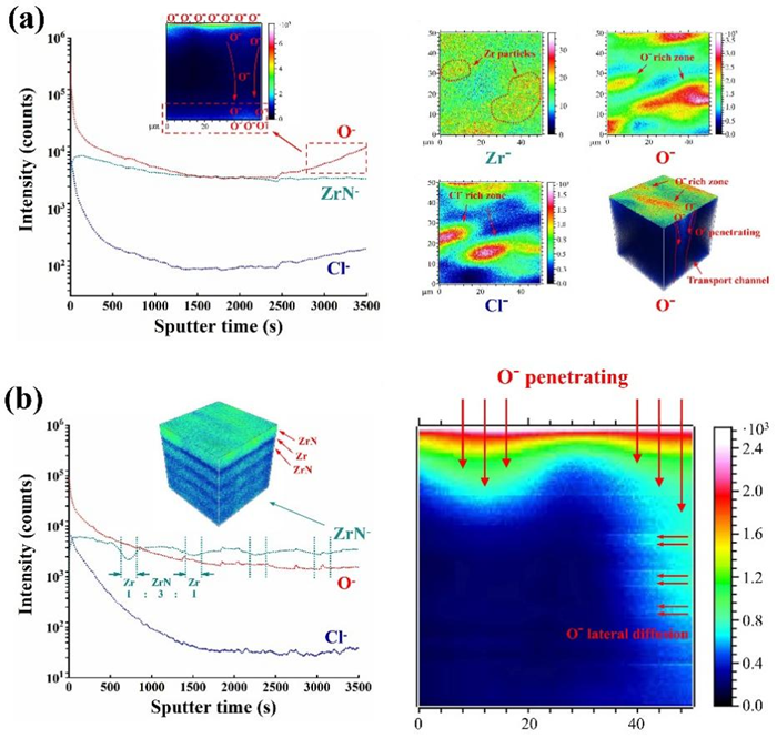 (a单一ZrN涂层动电位极化实验后的TOF-SIMS结果;bZr/ZrN多层涂层动电位极化实验后的TOF-SIMS结果)