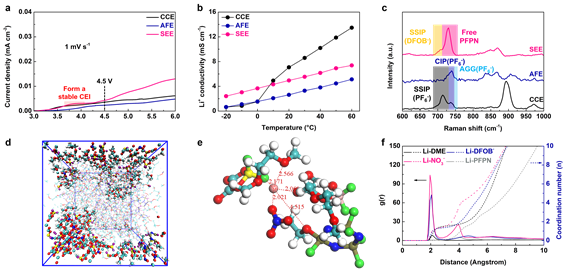 理化性质测试表明,SEE具有良好的高压稳定性,并且相较于传统的氟化电解液表现出更高的电导率。拉曼光谱和分子动力学计算研究表明,DME起到解离锂盐的作用主要分布在第一溶剂化鞘层,起到传输锂离子的功能。而PFPN起到稀释剂的作用分布于外溶剂化层,这些游离的PFPN赋予了SEE不燃的特性。