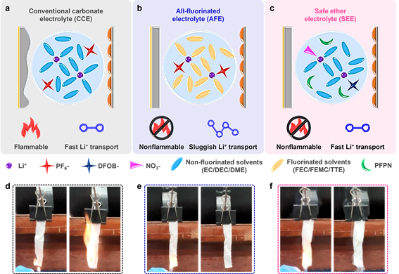 基于上述考虑,团队设计了一种安全的醚类电解液(SEE),以1,2-二甲氧基乙烷(DME)为主要溶剂,以保证锂离子的快速传输,并添加自熄添加剂乙氧基(五氟)环三磷腈(PFPN),赋予电解液不燃性。SEE结合了传统电解液高电导率和氟化电解液安全性的优点,并且与锂金属负极表现出良好的兼容性。
