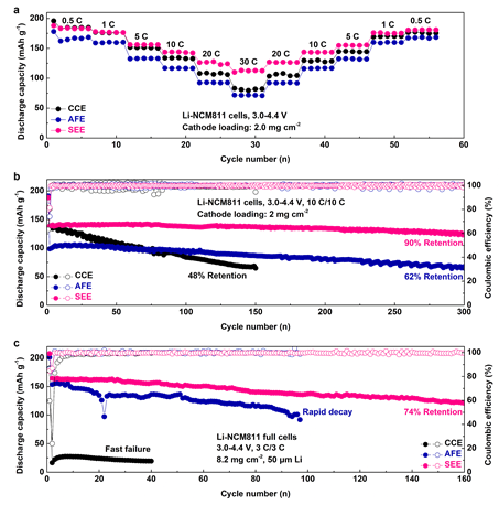 电化学测试表明,使用SEE组装的Li-NCM811电池在高达30 C的倍率下可以放电超过110 mAh g-1的比容量,并且在10 C的倍率下经过300次循环后仍能保持初始容量的90%。此外,用SEE组装的实用化Li-NCM811全电池在3 C的高倍率下也能实现稳定的循环。
