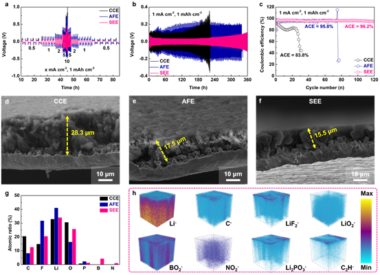 锂负极测试表明,SEE相较于传统电解液和氟化电解液表现出更优的锂负极兼容性,相应的SEM图显示锂在SEE中显示出最致密的沉积形貌。进一步对锂负极的界面成分分析可知,金属锂能在SEE中形成富含B/N/F的界面保护层,该保护层能够抑制电解液的副反应并提供快速的锂离子传输通道。
