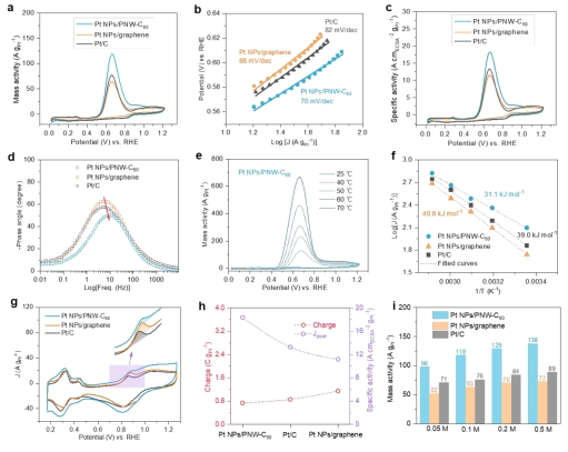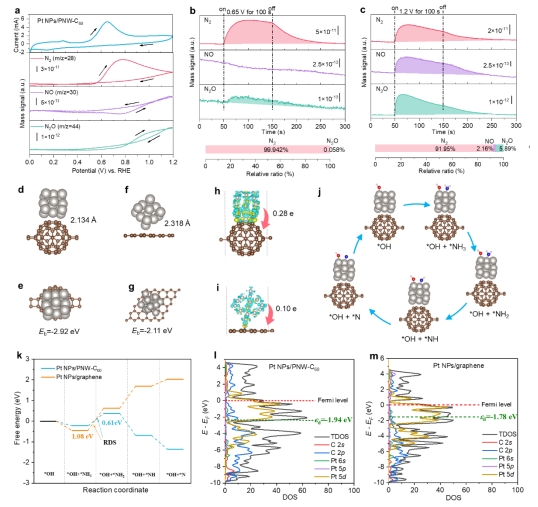 氨因其生产、储存和运输技术成熟,被认为是一种极具前景的氢载体。此外,通过电催化氨氧化反应(AOR)制氢所需的理论电位显著低于水电解。然而,AOR反应动力学缓慢及其稳定性差,限制了氨电解的工业化应用。我们构建了由二维共价键合的富勒烯聚合网络(PNW-C60)负载的铂纳米颗粒(Pt NPs)催化剂,可作为一种高活性和高稳定性的AOR电催化剂。二维富勒烯聚合网络独特的电子缓冲效应有助于含氮中间体的脱附,并缓解其在Pt NPs表面发生毒化。因此,所制备的富勒烯聚合网络负载的Pt NPs在AOR反应中表现出高达118 A gPt⁻¹的峰电流质量活性以及较好的稳定性,性能优于商业Pt/C和石墨烯负载的Pt NPs催化剂。本研究采用具有较大比表面积和独特电子结构的少层富勒烯网络作为金属载体,不仅拓展了二维富勒烯网络的应用范畴,而且对于开发高活性和稳定性的Pt基AOR催化剂具有一定的借鉴意义。