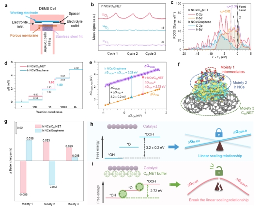 在电催化析氧反应(OER)中,含氧中间体(*OH、*O和*OOH)之间存在吸附能的线性标度关系,这一结构–性能耦合规律严重制约了催化剂活性的理论上限。团队提出了一种通过二维富勒烯网络(C60NET)的电子缓冲效应打破该标度关系的新策略。在构建的Ir纳米簇/C60NET(Ir NCs/C60NET)催化剂中,C60NET能够根据反应中间体的变化动态调控Ir活性位点的电子结构,从而调节*OH、*O和*OOH的吸附强度,打破它们之间的线性关系。这种电子缓冲作用显著提升了催化剂的本征活性和稳定性,使其在酸性电解液中展现出优异的OER性能,表现为低至237 mV的过电位和超过600小时的稳定运行寿命。对比实验和理论计算进一步揭示,C60NET通过可逆电子转移调控Ir氧化态演变,减缓Ir的过度氧化,有效提升了催化剂的结构稳定性和利用效率。本工作为针对单一活性位点打破标度关系以及高性能OER电催化剂的设计提供了新的思路。