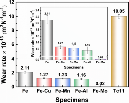 团队针对FeCoCrNi高熵合金涂层的高温磨损问题,采用Cu、Mn、Al、Mo元素掺杂策略,结合实验与第一性原理计算揭示了元素掺杂诱导润滑机制。其中Mo掺杂涂层性能最优,在700℃高温条件下的磨损率低至2×10-15m3N-1m-1。高温下该涂层表面形成的NiMoO₄氧化膜具备低键能特性,在磨损过程中发挥良好润滑作用,同时涂层在高温下仍保持较高硬度,二者协同作用显著提升了涂层的耐磨性能,较钛合金基体提升了两个数量级。A片网