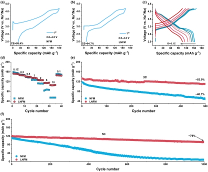 这种改性后的正极材料在高工作电压下展现出卓越的快速充电能力(5C时为121.6 mAh/g,仅需12 min即可充到额定容量的百分之八十),并且使用寿命得到极大地提高(1000次循环后仍保持76%初始容量)。此外,研究者通过同步辐射级TXM-XANES连用技术,表征并证实了通过改善材料的颗粒致密结构和降低充放电过程中的晶格应力可以减少副反应并保持高电化学活性,最终实现了快速充电、长寿命和高电压的钠离子电池。