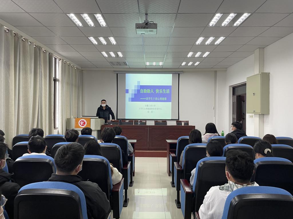 俞超老师以“自助助人 快乐生活”为主题,从“正确认识心理问题”、“常见的心理障碍识别”、“学生干部的‘攻心’之策”、“心理健康的自我调适”四个方面为同学们做了生动详细的讲解。他从学业、生活、情感、就业等方面娓娓道来,将心理健康专业知识与学生干部日常工作内容有机结合,进一步明确学生干部的角色定位和工作职责,强化心理危机意识,提高识别常见心理问题能力,全方位、多角度与同学们畅谈心理健康问题,分享心理学知识。学生干部们结合工作、生活分享感悟,俞超老师对同学开展心理工作时困惑与难点耐心解答,切实回应了同学们的需求。
