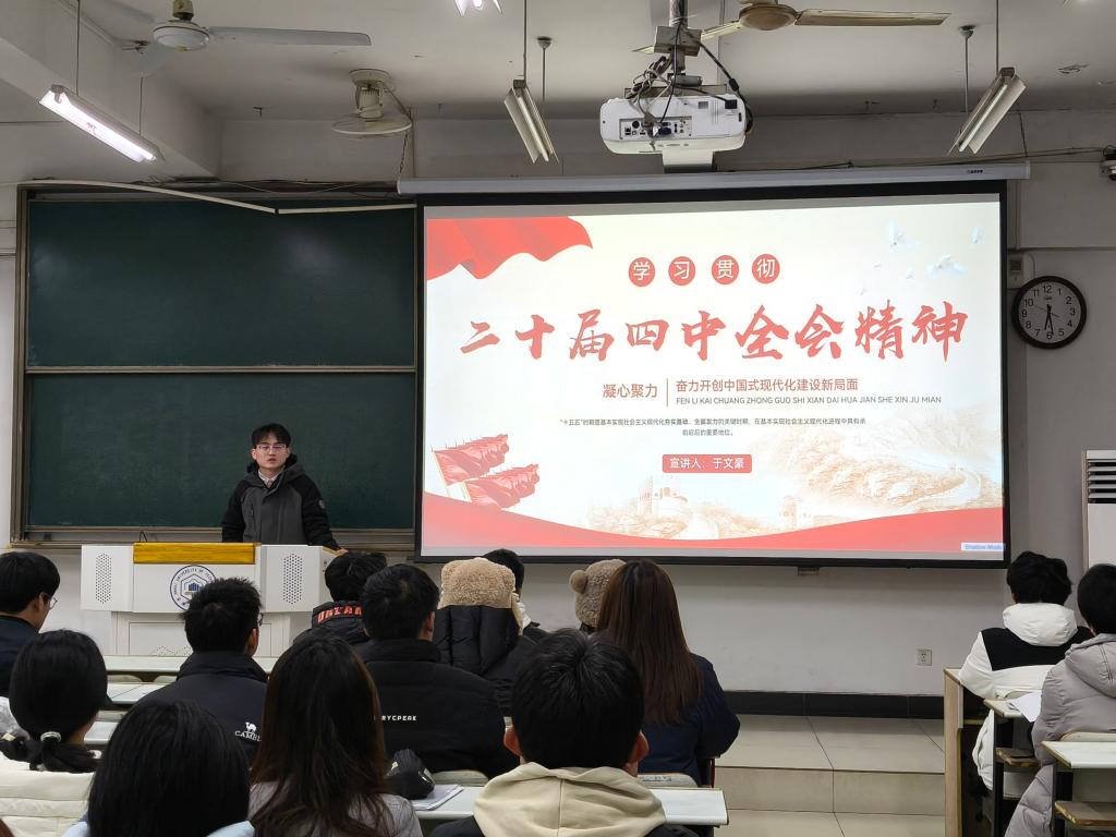 宣讲会上,于文豪以“汲取时代智慧,点燃青春引擎”为主题,结合工科院校特色与材料学科专业特点,从“制度密码”与“战略机遇”两个核心关键词切入,系统解读了党的二十届四中全会擘画的“十五五”宏伟蓝图,重点阐释了“加快高水平科技自立自强,引领发展新质生产力”的核心任务,让在场学子深刻理解中国特色社会主义制度的显著优势,明晰国家在人工智能、新材料、新能源等前沿领域的人才需求导向。